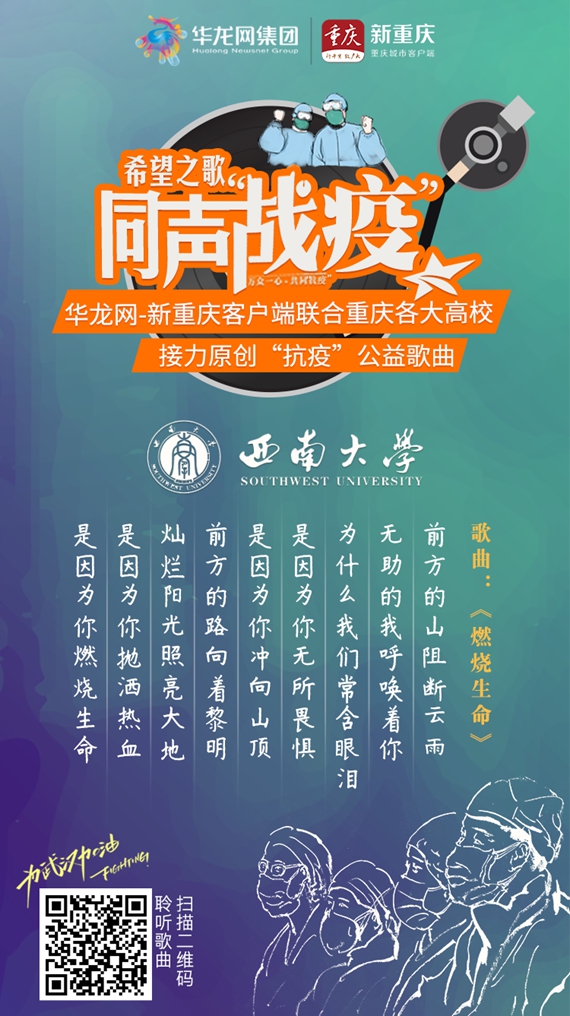 华龙网-新重庆客户端2月25日11时30分讯(李婷婷 刘春容)音乐汇聚力量,歌曲传递希望。新冠肺炎疫情以来,华龙网-新重庆客户端联合重庆市多所高校,接力原创“抗疫”公益歌曲,推出系列融媒体报道,重庆大学、sunbet申搏官方网站、西南政法大学、重庆医科大学、重庆师范大学、重庆邮电大学、四川外国语大学、重庆理工大学、重庆第二师范学院等高校凝心聚力,用原创音乐记录身边的“战疫”事迹,用音视频向“抗疫”一线的“战士”致敬。