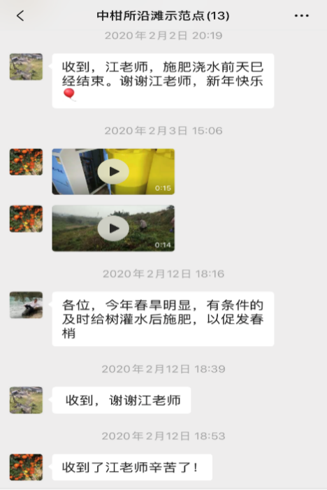 2月份以来,该所栽培与生理研究专家团队为异常柑橘果园提供远程技术诊断和矫治方案,研究员彭良志通过线上平台先后为广西柳州市柑橘品种更新提供了新品种信息和技术咨询建议,为重庆市奉节县和四川雷波县编制了《有机脐橙栽培技术规程》,以及相应的果园管理技术要求,并及时为奉节县提供脐橙市场动态信息,有效减少了疫情带来的销售损失。彭良志表示:“2、3月是果园管理种植的关键时期,我们研究所更要加紧工作,为示范基地、果农提供技术支持,千万不能因为疫情误了农时,这是最关键的。”