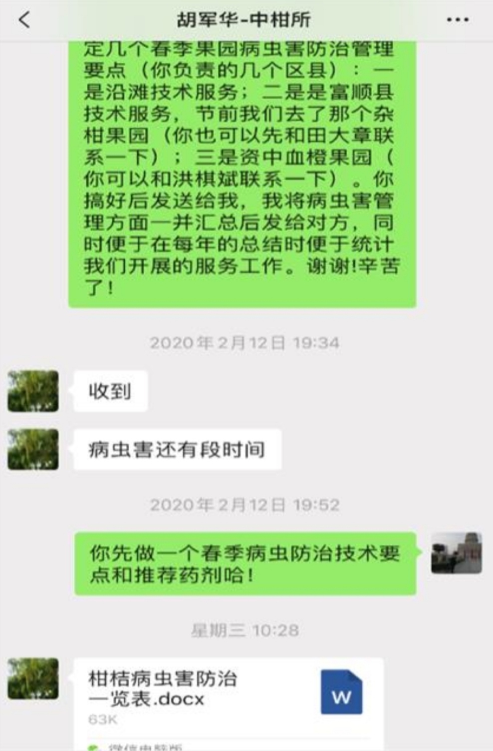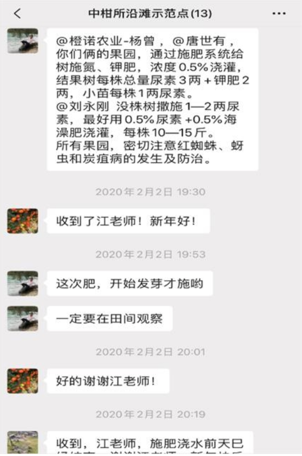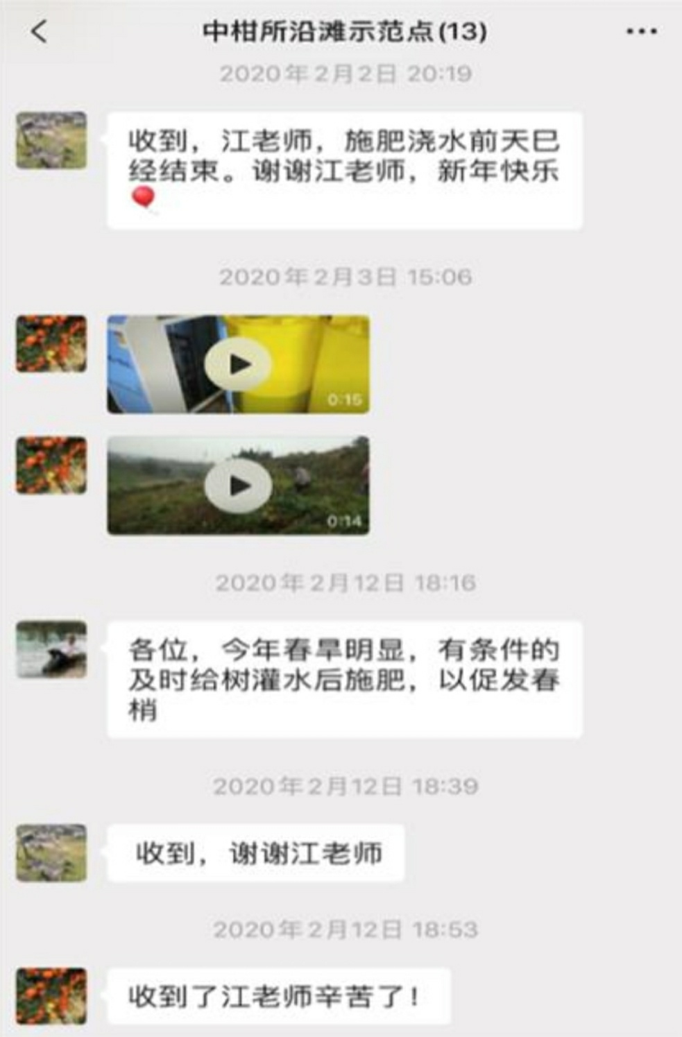 2月份以来,该所栽培与生理研究专家团队为异常柑桔果园提供远程技术诊断和矫治方案,彭良志研究员通过线上平台先后为广西柳州市柑桔品种更新提供了柑桔新品种信息和技术咨询建议,为重庆市奉节县和四川雷波县编制了《有机脐橙栽培技术规程》,以及相应的果园管理技术要求,并及时为奉节县提供脐橙市场动态信息,为疫情期间减少脐橙销售损失起了较好作用。彭良志研究员表示:“2、3月是果园管理种植的关键时期,我们研究所更要加紧工作,为示范基地、果农提供技术支持,千万不能因为疫情误了农时,这是最关键的。”