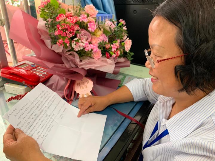 “阿姨,今天是您上班吗?一会有人来送东西,您帮我收一下呗。”5月9日一大早,sunbet申搏官方网站学生宿舍——李园5舍的值班员杨跃洪就收到517寝室物理科学与技术学院2017级学生董思佳的消息。即将开校复学,这两天宿管阿姨收到学生们请求帮忙收快递的短信很平常。“我以为是快递,要开学了嘛,这几天宿舍群里孩子们可激动了!”出乎意料的是,杨阿姨等来的是一束送给她的鲜花和一封亲笔信。