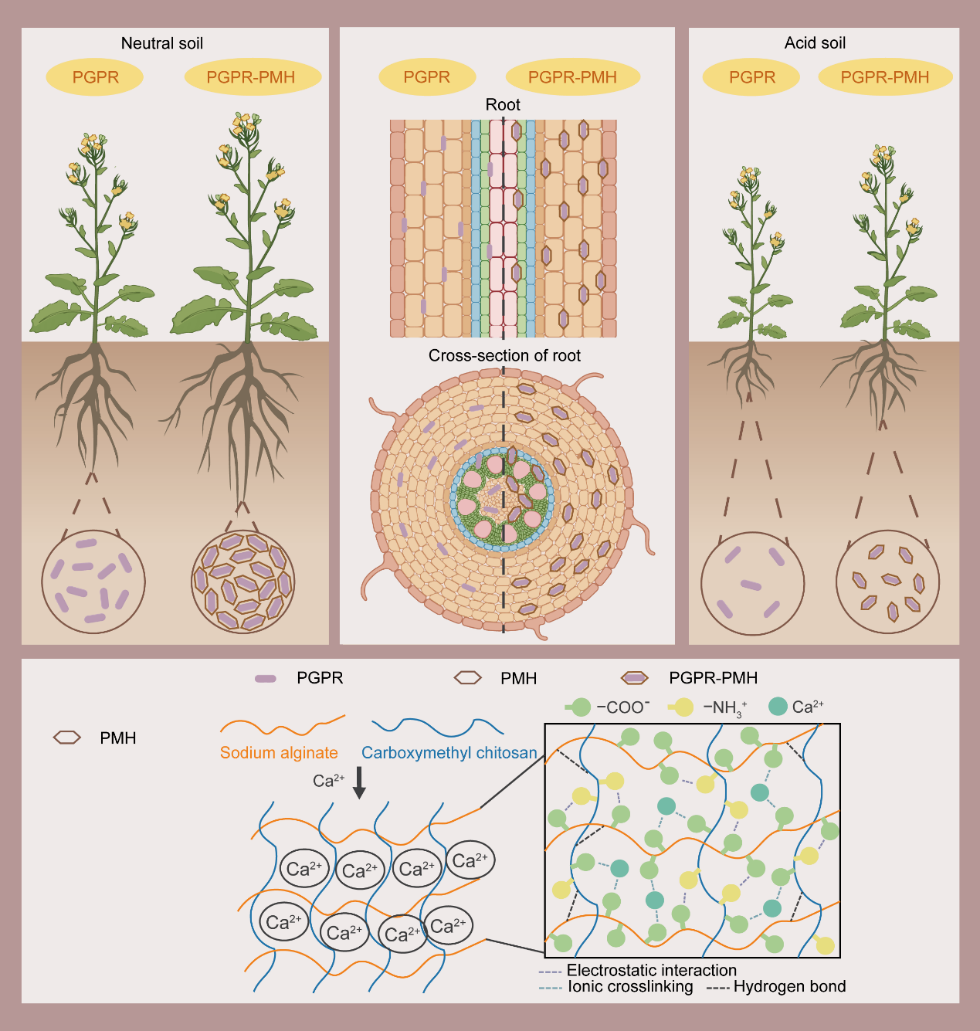 针对以上问题,研究选择了内生PGPR粘着箭菌C5作为开发生物肥料的基本菌株,以提高其促生效率,并基于羧甲基壳聚糖、海藻酸钠和氯化钙,设计了一种聚合水凝胶(PMH)用于提高PGPR的促生效率并阐明其作用机制。PMH可以促进内源PGPR在植物根系的中柱部位定殖,影响植物激素的分泌和木栓质的沉积,增强植物的抗氧化活性和代谢能力,从而促进植物生长,并抵御酸性环境。该研究有助于提高农业生产效率和减少环境污染,为以可持续的方式实施生物材料支持的农业实践提供了可能性。
