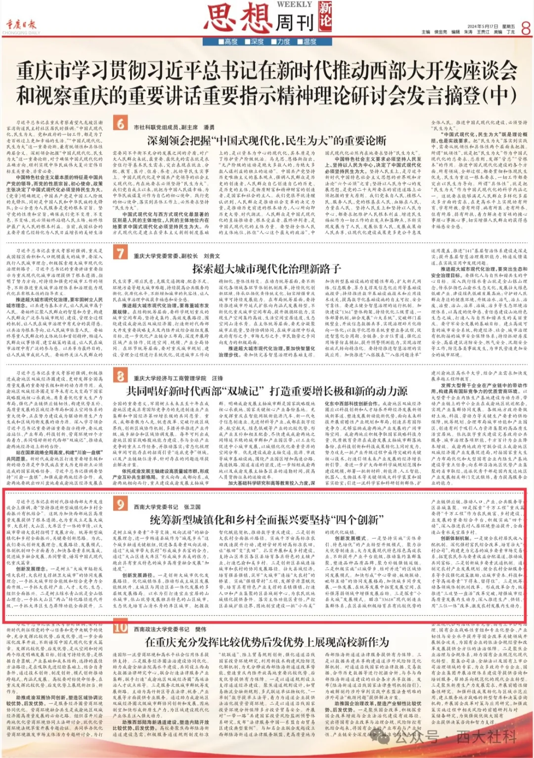 习近平总书记着眼以中国式现代化全面推进强国建设、民族复兴伟业,在新时代推动西部大开发大局中赋予了重庆新的时代使命和战略定位,为重庆发展带来了前所未有的重大历史性机遇。为推动习近平总书记殷殷嘱托落实落地、见行见效,5月13日,重庆市召开学习贯彻习近平总书记在新时代推动西部大开发座谈会和视察重庆的重要讲话重要指示精神理论研讨会。我校党委书记张卫国出席研讨会并作了题为《统筹新型城镇化和乡村全面振兴要坚持“四个创新”》的研讨发言,这是我校人文社科专家积极主动对接国家、区域重大战略和地方发展实际需要,努力为助推区域经济高质量发展和乡村全面振兴贡献智慧和力量的重要表现,为新时代推动西部大开发贡献了sunbet申搏智慧。5月17日,《重庆日报》进行了摘登。