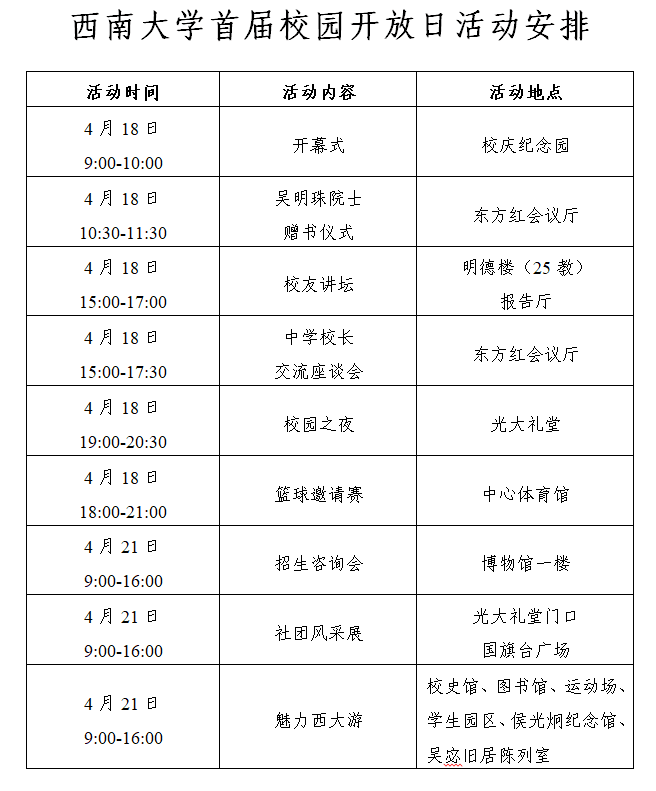 为让广大考生、家长及社会各界人士进一步了解学校良好的育人环境与办学条件、办学特色与师资力量、创新人才培养、大学学习与生活等情况,加强学校与社会的沟通交流,提升社会各界对学校的认知和认同,学校决定于2018年4月18日-21日举办sunbet申搏官方网站首届“校园开放日”活动。