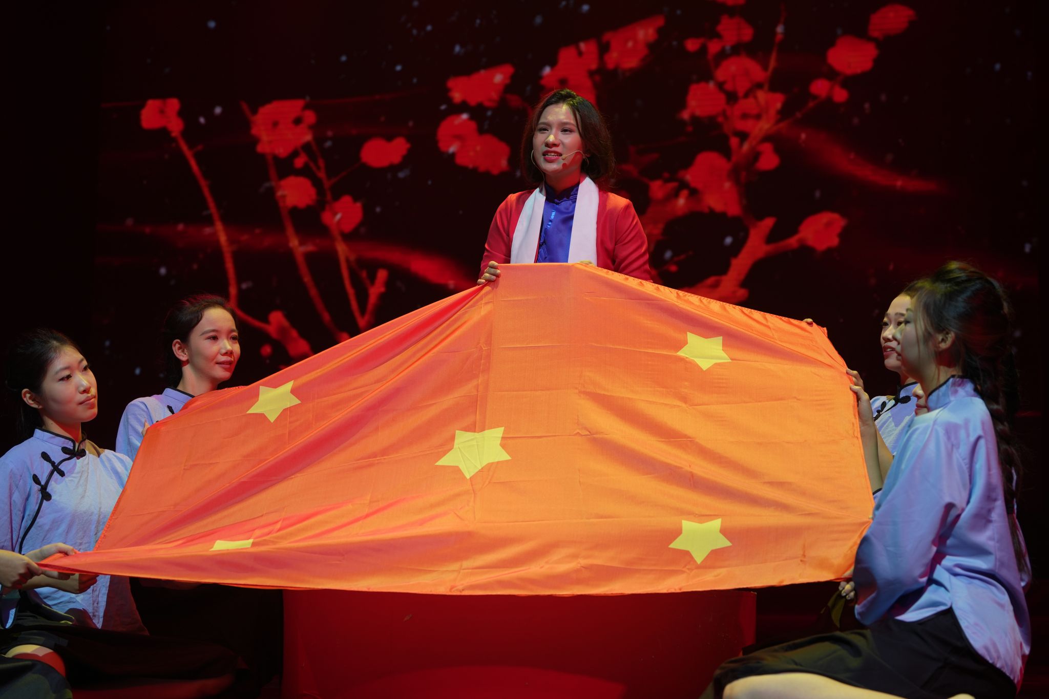 四个篇章的演绎精彩纷呈,合唱《沁园春·雪》以青春朝气歌颂先辈们不畏艰苦、朝夕为国的铮铮誓言,激励新时代青年厚植家国情怀、勇担时代重任;歌舞《红旗颂》则通过中国舞的优美语汇,编织出一曲对革命岁月的无声赞歌;诵读《我的自白书》饱含深情、铿锵有力,鼓舞青年以英雄为榜样,坚定理想信念,团结奋进、砥砺前行……演员们全情投入、演绎动人,现场掌声阵阵,气氛庄重而热烈。