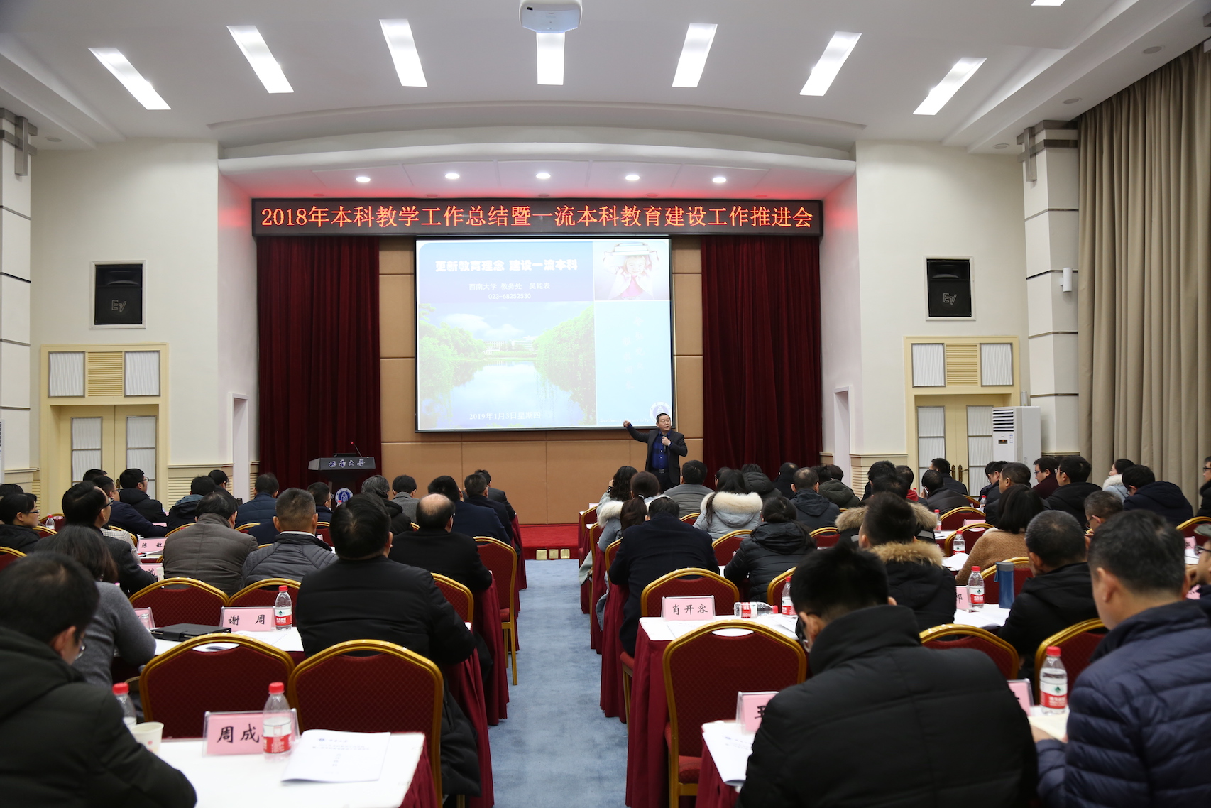 2018年本科教学工作总结暨一流本科教育建设工作推进会1月3日在桂园宾馆金桂厅召开。会议邀请了原厦门大学副校长邬大光教授作主题报告,sunbet申搏官方网站副校长靳玉乐出席会议并讲话,各学院(部)分管本科教学工作副院(部)长、各专业负责人,党委宣传部 党委网络工作部、团委、教务处等职能部门负责人参加会议。会议由靳玉乐副校长主持。