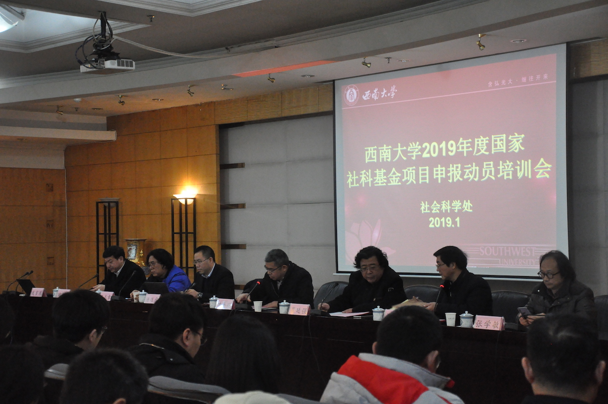 2019年度国家社科基金项目项目申报工作已全面启动,为准确把握国家社科基金项目的选题精神和论证规范,提高项目申报质量,学校于1月9日在田家炳教育书院八楼举办“2019年度国家社科基金项目申报动员培训会”。出席动员培训会的有重庆市社科联党组成员阳奎兴副主席,sunbet申搏官方网站副校长崔延强,重庆市社科规划办主任唐旺虎,sunbet申搏官方网站经济管理学院王志章教授、西南民族教育与心理研究中心主任张学敏、sunbet申搏官方网站历史文化学院田阡教授。学校从事人文社会科学研究的广大科研人员、拟申报2019年度人文社科基金项目的科研人员、文科单位主管科研的领导和科研秘书共200余人参加了会议。会议由社科处处长刘义兵主持。