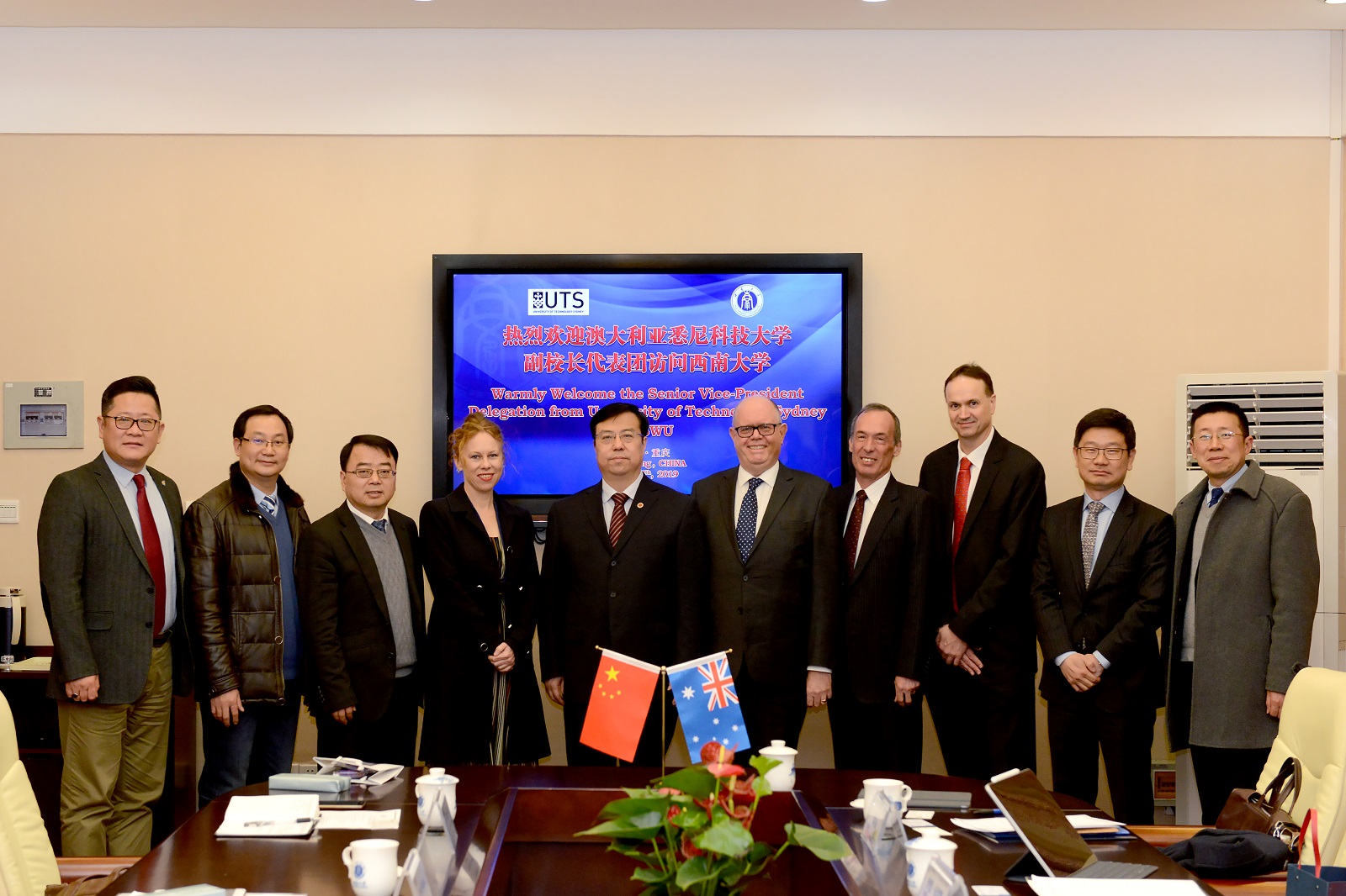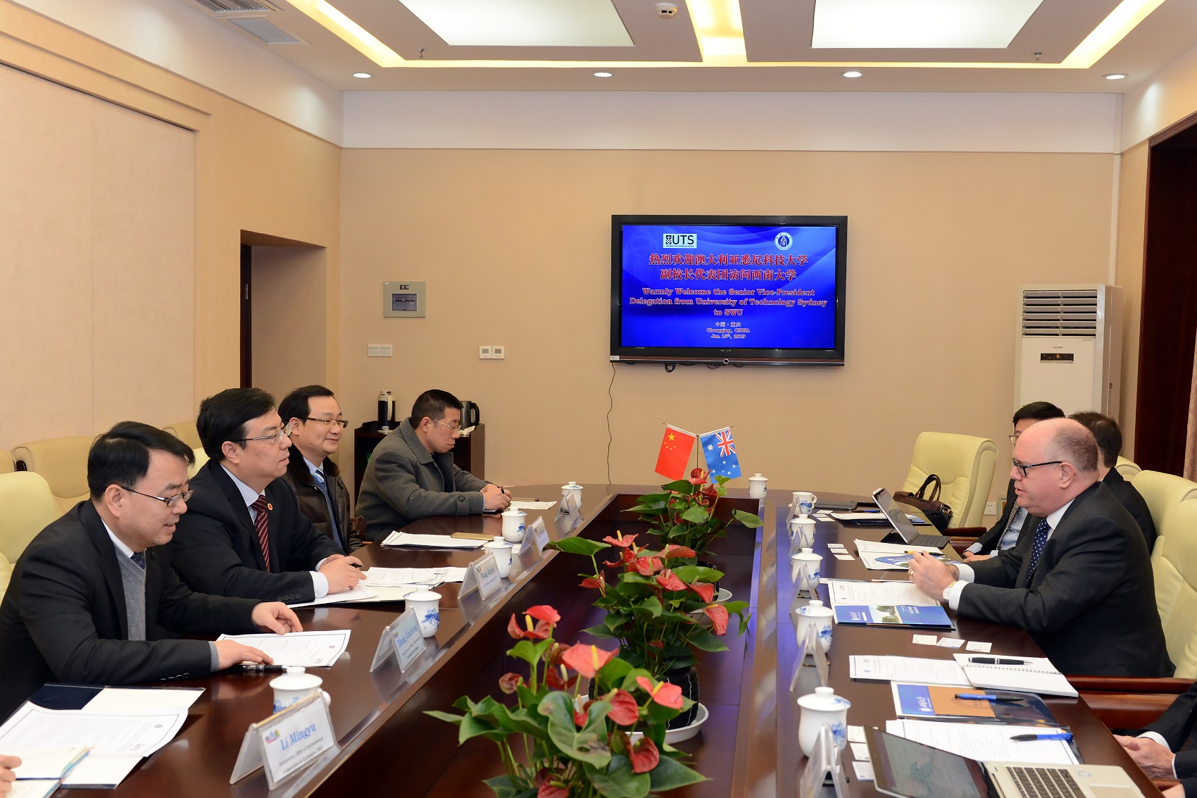 王进军副校长致辞欢迎帕菲特副校长一行,感谢澳大利亚教育管理集团持续不断地为学校引荐澳方优质高等教育资源。在简要介绍学校情况后,王校长向来访客人重点介绍了重庆市政府关于鼓励在渝高校与国外知名高校开展联合申报中外合作办学项目和机构的政策和举措,希望双方抓住历史机遇,共同探讨联合申报人工智能等领域独立法人机构合作意向、基础、条件、框架等,以携手促进两校国际化办学进程。