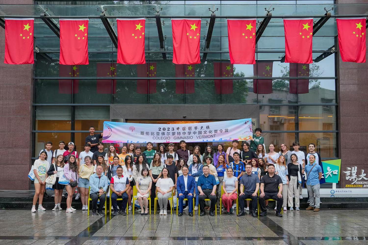 6月17日上午,“2023sunbet申搏官方网站-哥伦比亚威尔蒙中学中国文化夏令营”开班仪式在国际学院紫云楼举行,来自哥伦比亚威尔蒙中学的46名师生来到学校,开启为期7天的参访学习。国际学院党委书记刘猛,中国对外文化集团有限公司文旅板块副总经理张猛,威尔蒙中学领队Naiver Lenith Niño Velásquez等参加开班仪式,仪式由外国学生招生工作办公室主任黄无为主持。