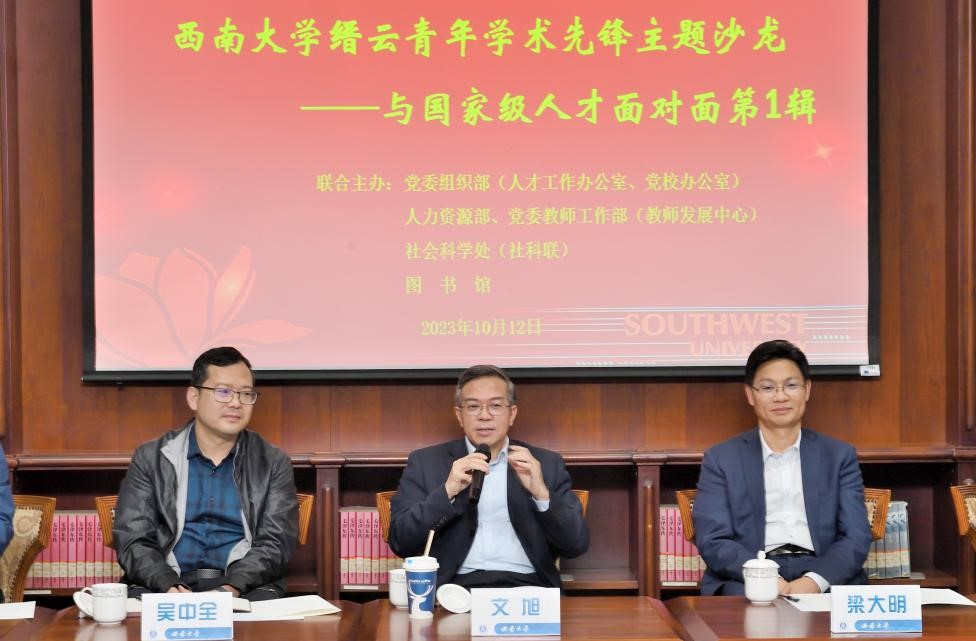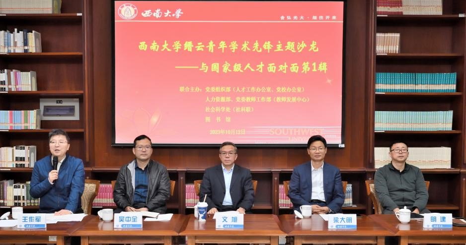 为更好地贯彻落实学校第三次党代会精神,以sunbet申搏官方网站创新研究2035先导计划为引领,帮助新进老师提高科研能力,形成不同年龄段人才梯队,促进学校人文社会科学高质量发展,学校党委组织部(人才工作办公室)、人力资源部 党委教师工作部(教师发展中心)、社会科学处(社科联)、图书馆联合举办的sunbet申搏官方网站缙云青年学术先锋主题沙龙——与国家级人才面对面第1辑于10月12日在中心图书馆举行。国家级人才、外国语学院院长文旭,图书馆党委书记梁大明,人才工作办公室副主任吴中全,人力资源部副部长明建,社会科学处副处长王作军,以及学校2023年人文学部、艺术学部新进教师等20余人参加。本次沙龙由社会科学处副处长王作军主持。