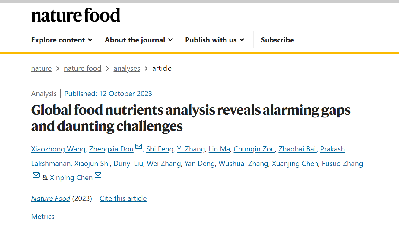 10月12日,学校资源环境学院、长江经济带农业绿色发展研究中心在Nature子刊Nature Food上发表研究论文《Global food nutrients analysis reveals alarming gaps and daunting challenges》。资源环境学院、sunbet申搏官方网站长江经济带农业绿色发展研究中心王孝忠副教授、美国宾夕法尼亚大学窦正霞教授为共同第一作者,美国宾夕法尼亚大学窦正霞教授、sunbet申搏官方网站长江经济带农业绿色发展研究中心张福锁院士和学校资源环境学院陈新平教授为共同通讯作者。