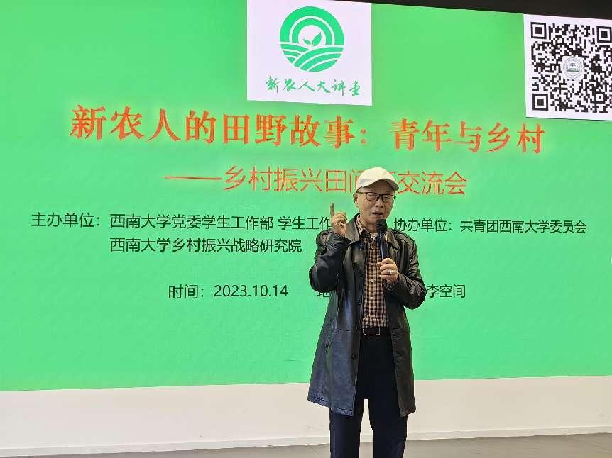 10月14日下午,由党委学生工作部 学生工作处、乡村振兴战略研究院主办,团委协办的“新农人的田野故事—乡村振兴田间行”交流会在青李空间举行。来自“乡村振兴田间行”2023实习生和暑期志愿者,学校涉农学院100余名同学参加交流学习。晏阳初先生侄孙、sunbet申搏官方网站中国乡村建设学院名誉院长晏鸿国老先生特邀出席活动。相关部门领导、老师,农学与生物科技学院、教育学部教师代表,大理新生活实践者、四十英尺民宿主理人王丹,中国电影家协会会员、中国电视艺术家协会成员韩君倩导演,巴渝农耕文化陈列馆馆长刘刚受邀出席活动。乡村振兴战略研究院培训中心主任张斌主持交流会。