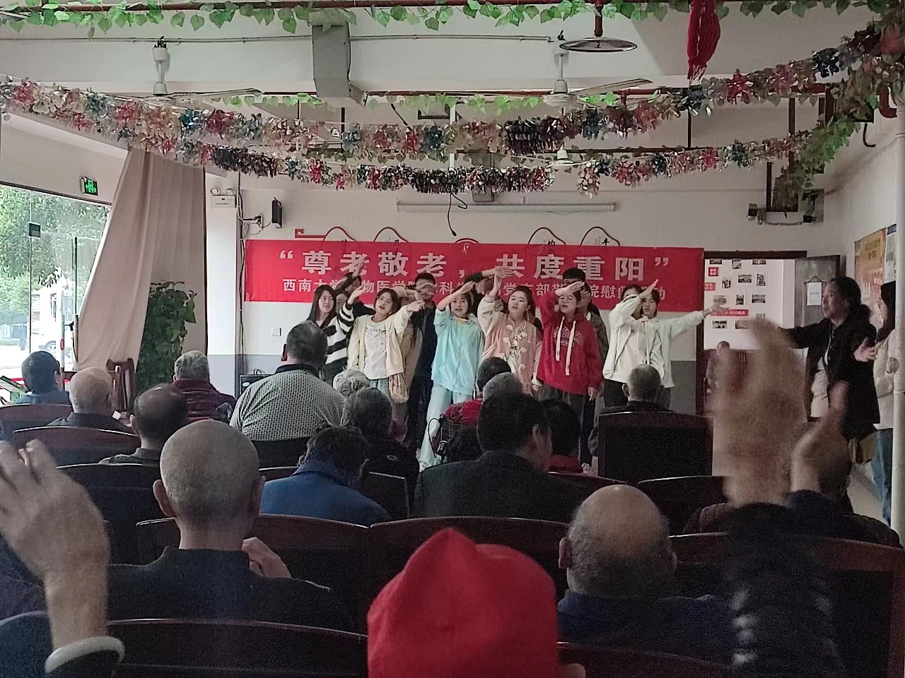 活动伊始,学生党员们为老人们带来了精心准备好的文艺表演,带动了现场的欢乐气氛。学生党员们为老人们带来了八个活力满满的节目,现场掌声连连;最后在学生们的带领下,大家一起合唱了歌曲《我和我的祖国》,现场气氛达到高点。台上台下同学们与老人积极互动,倾听他们的往事,了解他们当下的生活。活动尾声,大家为老人们送上节日祝福和佳节礼物,传递真情,欢声笑语,温暖重重。