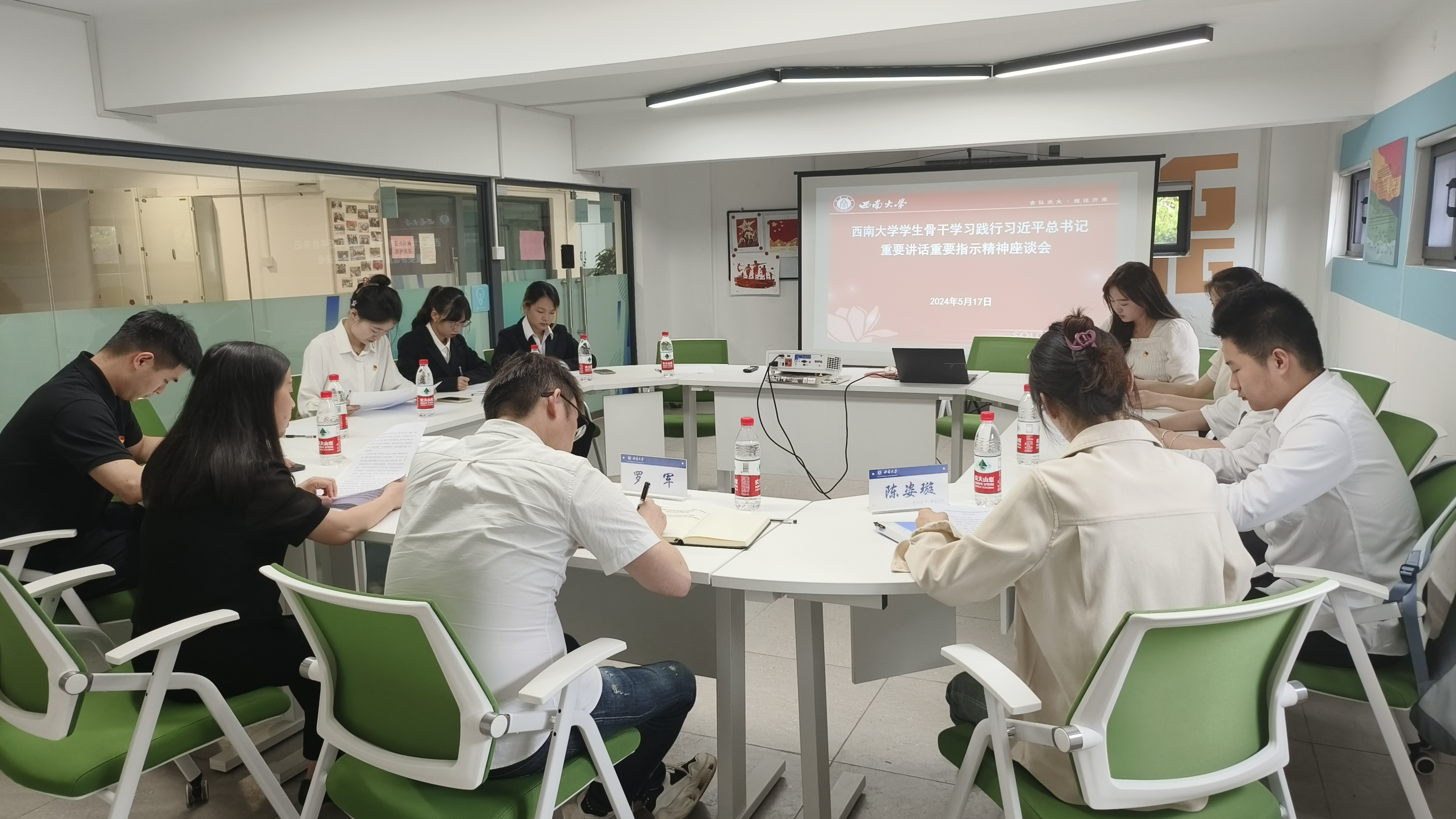 为深入学习习近平总书记视察重庆重要讲话重要指示精神及新时代推动西部大开发座谈会会议精神,贯彻落实习近平总书记对新时代青年重要寄语精神及对学校思政课建设作出的重要指示,不负习近平总书记对广大青年学子的殷切期待,2024年5月17日,sunbet申搏官方网站学生骨干学习践行习近平总书记重要讲话重要指示精神座谈会在荣昌校区青樟空间召开,学校党委学生工作部(处)副部(处)长罗军、新闻传媒学院辅导员郭志聪、商贸学院辅导员陈姿璇出席会议,学生党员示范班代表、优秀学生标兵代表、荣昌校区学生骨干代表参加,会议由学校党委学生工作部(处)副部(处)长、荣昌校区学生工作办公室主任罗艳芬主持。