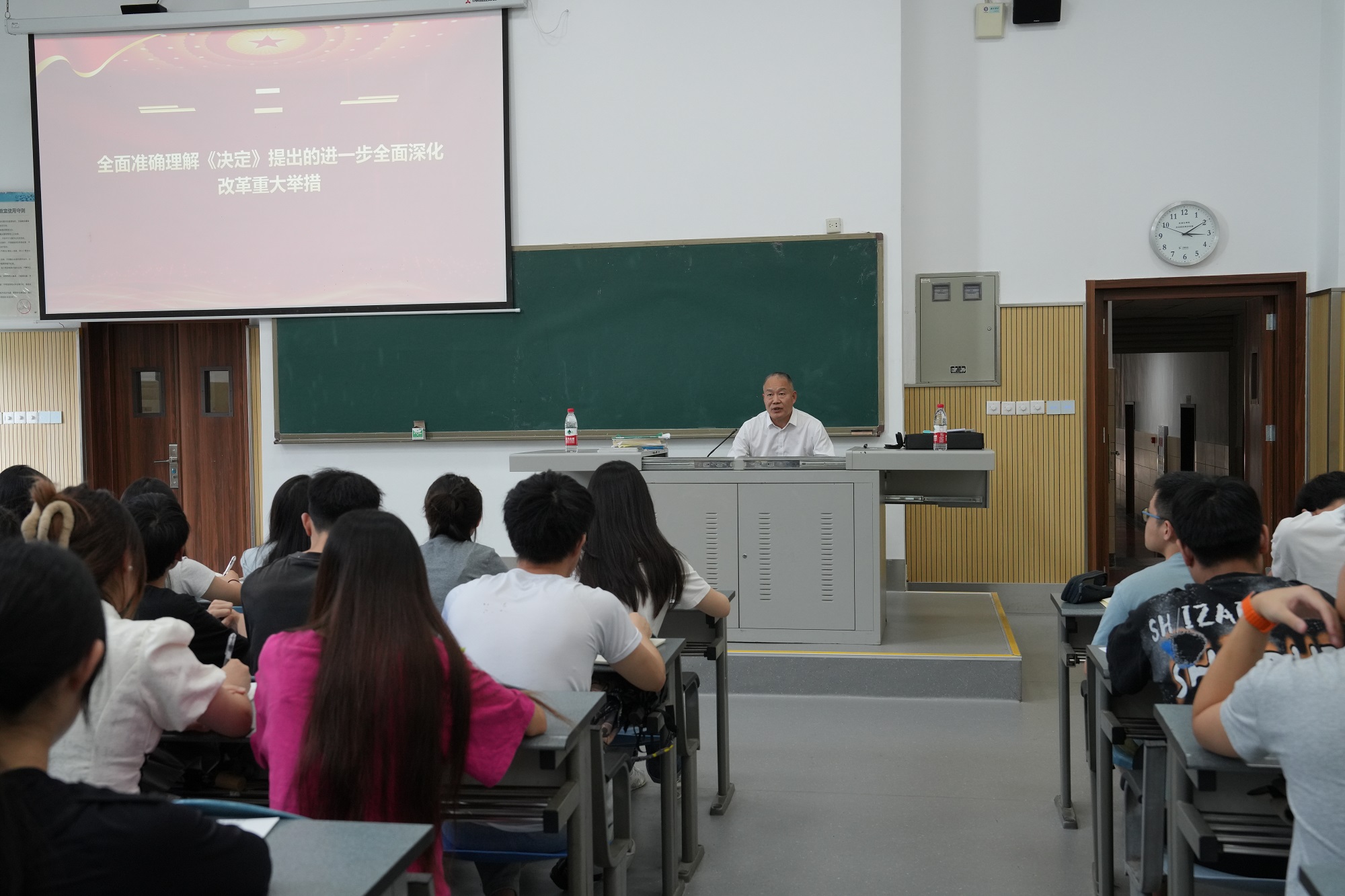 葛信勇副校长的讲授分为三大部分:第一部分聚焦学习领会习近平总书记在党的二十届三中全会上的重要讲话精神和全面准确理解《决定》提出的进一步全面深化改革重大举措等两个方面内容系统宣讲了二十届三中全会精神。第二部分从习近平总书记在全国教育大会上的讲话深刻阐释了教育强国的科学内涵和基本路径、深刻阐述了教育强国建设要正确处理好的重大关系、系统部署了全面推进教育强国建设的战略任务和重大举措等方面内容全面解读了全国教育大会精神;第三部分以“教育强国、sunbet申搏何为”为题,向同学们介绍了sunbet申搏官方网站贯彻落实党的二十届三中全会精神和全国教育大会的具体举措和行动路径。葛信勇号召全校师生紧密地团结在以习近平同志为核心的党中央周围,高举改革旗帜,凝聚改革合力,直面问题攻坚克难,敢为人先大胆探索,唯实争先狠抓落实,全力交出改革高分报表,为教育强国建设贡献sunbet申搏力量。